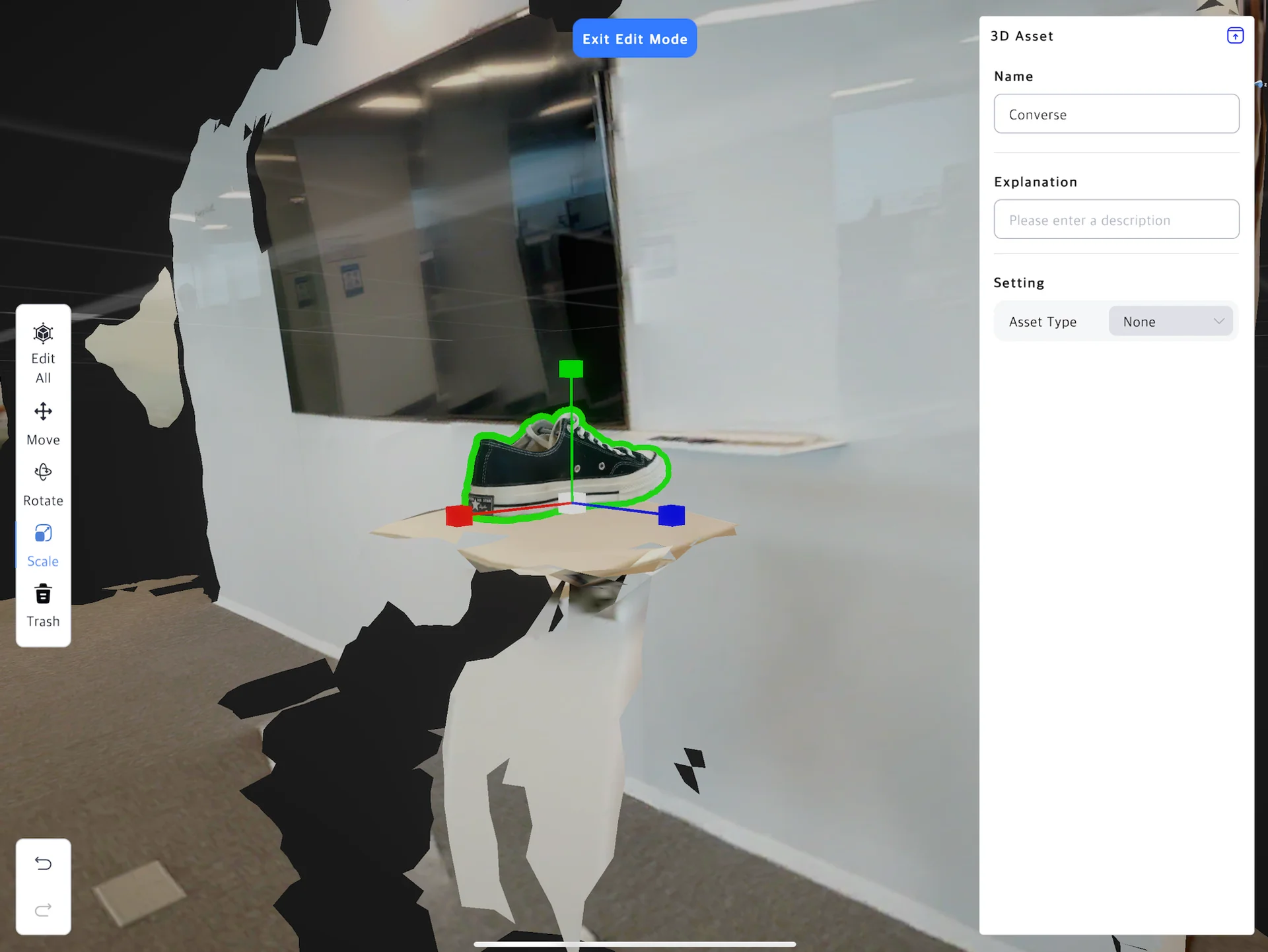 현실 공간을 스캔하여 만들어진 3D map인 Spatial의 Edit 모드에서 제작한 3D 에셋을 배치 가능합니다. 이후 자신이 원하는 장소에서 에셋을 증강시킬 수 있습니다.