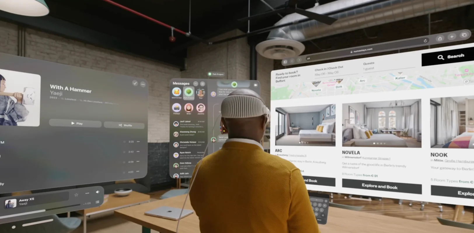 이미 우리가 매일 사용하는 컴퓨터처럼, 음악 감상, 메신저, 인터넷 탐색 같은 기능도 Apple Vision Pro에서 AR을 통해 경험할 수 있습니다. 기존의 컴퓨터 기능을 AR로 제공하는 특별한 컴퓨터인 것입니다.